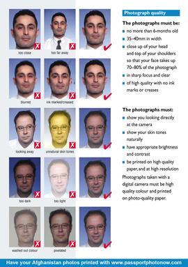 Three (3) identical photographs must be submitted, They should be 34mm x 40mm in Width and Height. They should show a close up of your face and the top of your shoulders so that your face takes up between 70% – 80% of the face or 28mm to 32mm from the chin to the crown of the head. The photo must clearly show the person’s facial features in a straight forward position from the tip of the chin to the crown of the head as well as the left and right sides of the face. In the case of voluminous hair, it must be ensured that the head (including the hairstyle) is fully depicted without reducing the size of the face, if possible. The face must be centered in the photo and no more than six months old, to ensure an up to date likeness.