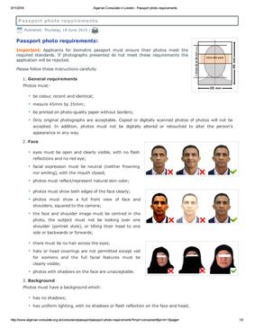 If you have or know of newer information about Algerian Passport, Visa, Citizenship or ID photo requirements that is different than the specifications you see on this page, please let us know and we will review and include your helpful information in our next updated of this page.